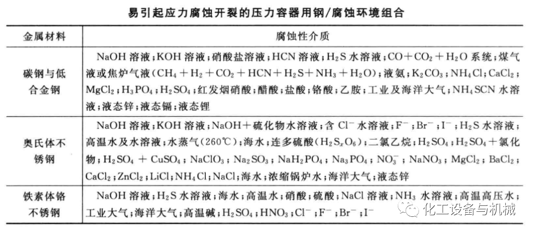 某种金属材料只有在特定的腐蚀环境中,才发生应力腐蚀开裂。下表是容易引起应力腐蚀开裂的压力容器用钢和腐蚀环境的组合。可见,几乎每一种材料都有可能发生应力腐蚀开裂。
