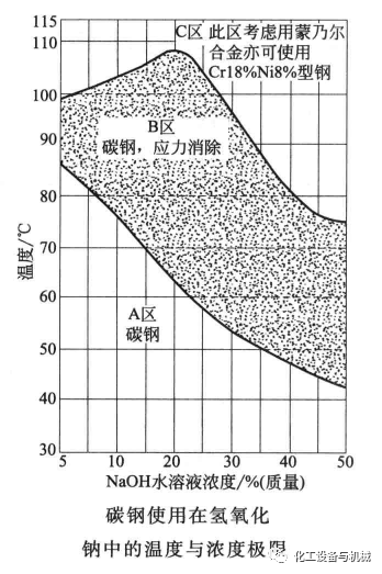 金属在氢氧化钠溶液中的应力腐蚀开裂称碱脆。碳钢、低合金钢、不锈钢等多种金属材料皆可发生碱脆。氢氧化钠浓度在5%以上的全部浓度范围内,碳钢几乎都可能产生碱脆;碳钢及低合金钢的温度和氢氧化钠浓度超过曲线对应的限定值时,焊后应进行消除应力热处理。碳钢及低合金钢压力容器壳体用钢板的腐蚀裕量不得小于3mm,以增强耐均匀腐蚀能力并降低壳体应力水平。盛装氢氧化钾溶液的碳钢及低合金钢焊制容器也应参照上述要求。