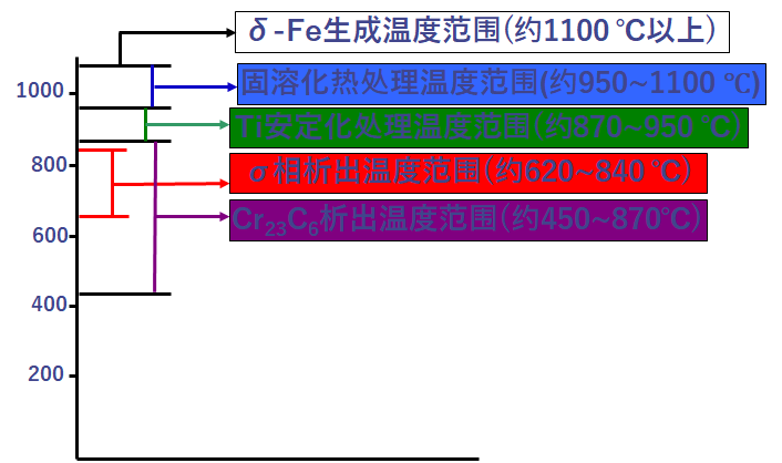 1)安定化处理温度:高于铬的碳化物溶解温度(450-870℃)低于或略高于TiC和NbC的溶解温度(750-1120 ℃)。一般推荐为870-950 ℃。