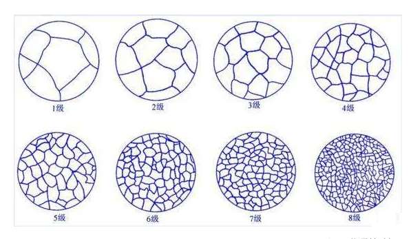 由图可知,晶粒度级别越大,实际晶粒就越小。其中1-3号一般被认为是粗晶粒,4-6号为中等晶粒,7-8号为细晶粒。