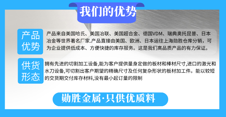 材料主要来自:德国VDM,法国阿赛洛,奥托昆普Outokumpu,美国哈氏Haynes,美国超合金SMC,美国冶联ATI,日本冶金,宝武特钢,山西太钢。