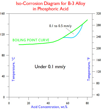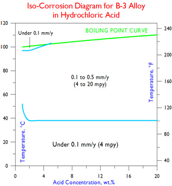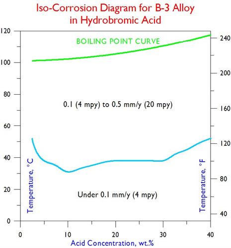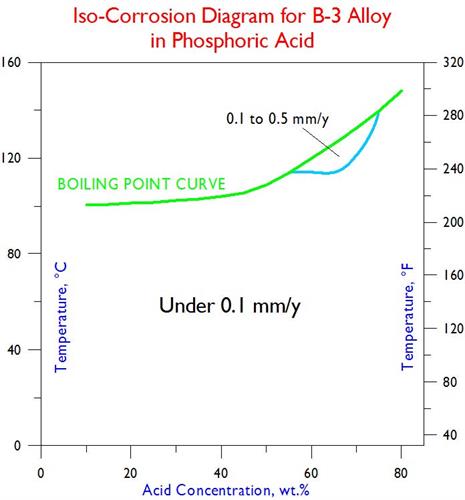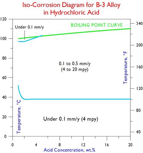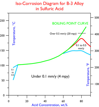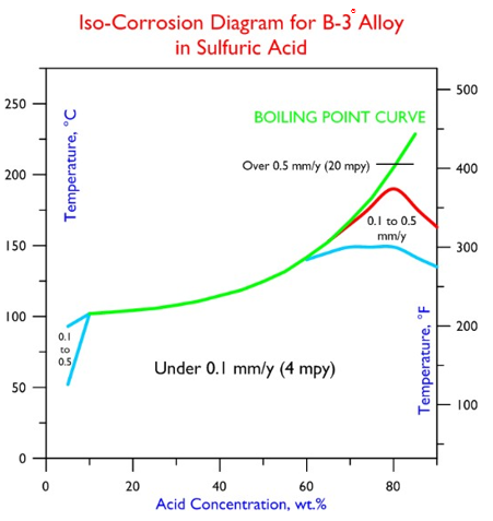 这些等腐蚀图中的每一个都是使用在不同酸浓度和温度(高达沸点)下生成的大量腐蚀速率值构建的。蓝线表示酸浓度和温度的组合,根据试剂级酸的实验室测试,预计腐蚀速率为 0.1 mm/y(每年 4 密耳)。低于该线时,预计速率低于 0.1 mm/y。硫酸图中的红线表示酸浓度和温度的组合,预计腐蚀速率为 0.5 mm/y(每年 20 密耳)。在红线以上,预计速率超过 0.5 mm/y。在蓝线和红线之间,预计腐蚀速率在 0.1 到 0.5 mm/y 之间。这些图表不能预测沸点曲线以上的腐蚀速率。